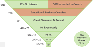 Just making a sale is not enough. Existing and new clients are likely to start with a ‘toe in the water’, so the real selling process starts after the ‘First Sale’, which could potentially be paid for training, right through to becoming a key member of the client’s Management Team, PLUS provision of a full Outsource Finance Function and a focus on the corresponding metrics: