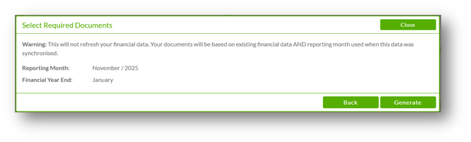 You will then be reminded of the Reporting Month and Financial Year End used last time the data was synchronised, if you are happy that these can remain the same simply click ‘Generate’. You will then skip the process of synchronising your data and go straight to the report generation stage.