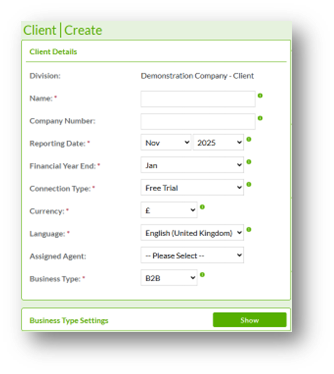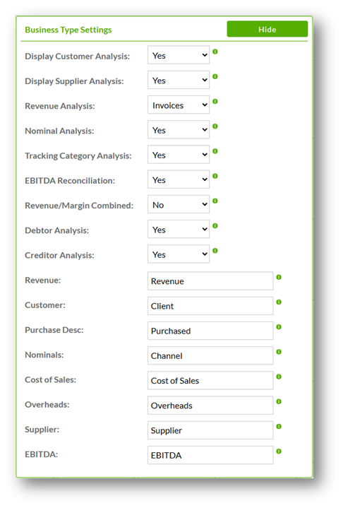 The ‘Business Type Settings’ is where you can further tailor you reporting to meet the specific requirements of the business they are being produced for. You are able to make the following choices.
